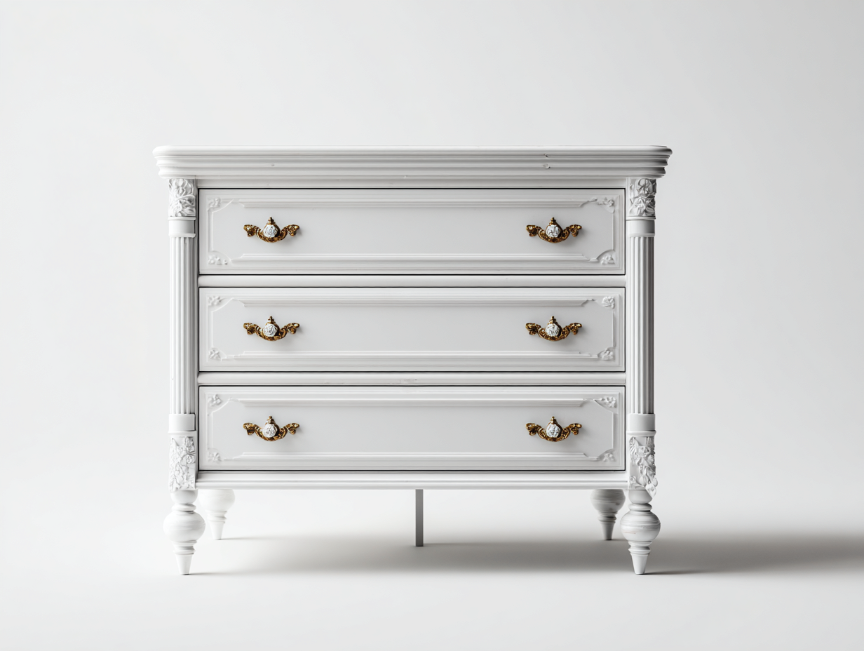 Cassettiera dallo stile classico con dettagli decorativi raffinati, ideale per ambienti domestici come la camera da letto o il soggiorno. La struttura elegante conferisce un carattere distintivo mantenendo una funzione contenitiva pratica.