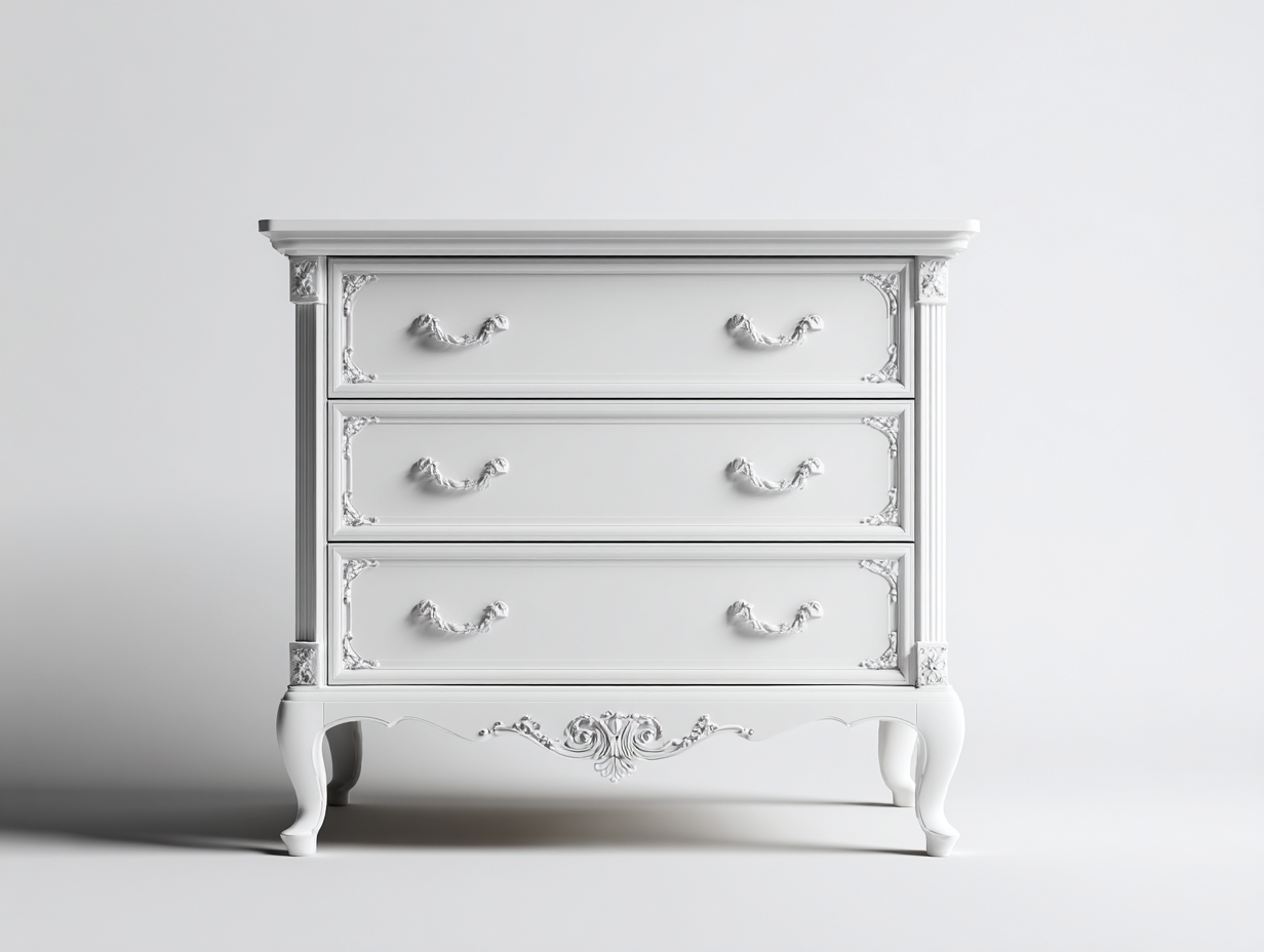 Cassettiera dallo stile classico con dettagli decorativi eleganti, adatta a valorizzare ambienti domestici come la camera da letto o il soggiorno. La struttura compatta unisce funzionalità contenitiva e un'estetica tradizionale raffinata.