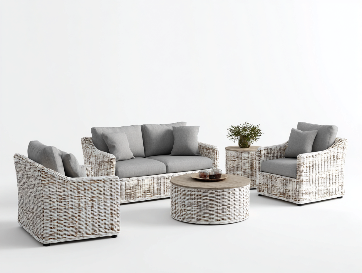 La struttura e realizzata in rattan sintetico intrecciato di colore bianco pensato per l uso esterno. Le sedute sono dotate di cuscini rivestiti in tessuto per esterni di colore grigio. Il tavolino presenta una struttura in rattan con piano superiore in legno dall aspetto naturale.