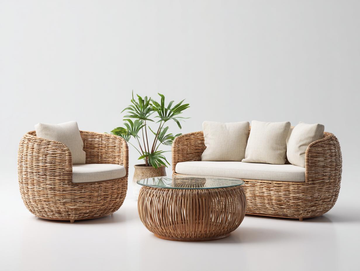 Divano da esterno progettato per arredare giardino terrazza o veranda con uno stile naturale e armonioso. La composizione con sedute coordinate e tavolino centrale crea una zona relax equilibrata adatta all utilizzo quotidiano in ambienti outdoor.